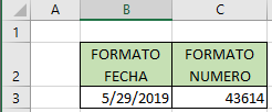 En el cuadro podemos ver que en la celda B3 tenemos la fecha en su formato usual y en la C3 tenemos la misma fecha, pero en formato número.