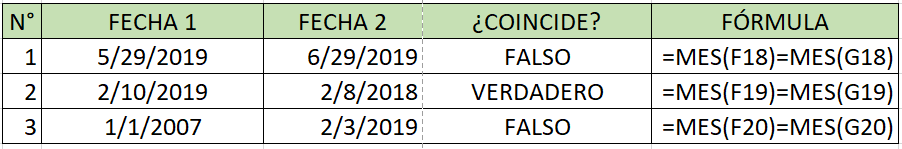 Esta fórmula está compuesta por 2 funciones MES. La función extrae el mes para cada fecha y las iguala. Así, al igualarlas tenemos 2 posibles resultados: