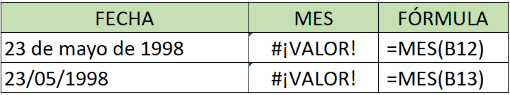 En el primer caso vemos que la fecha está redactada, por lo tanto, la función mes, al no poder leerlo, arroja el error. Lo mismo sucede en el segundo caso, pues pese a que se visualiza como una fecha válida, al estar en formato “Texto”, Excel tampoco lo puede leer.