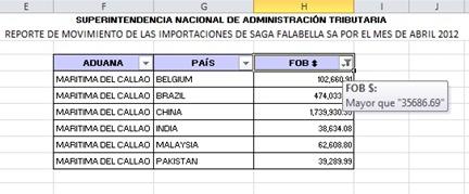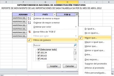 Haciendo clic en la flecha del encabezado de la columna FOB, elija la opción Filtros de números, la cual nos da varias opciones de filtrado, entre las que se incluyen: Igual a,  Mayor que,  Menor que, Mayor o igual que, Menor o igual que y No igual a,  o en Filtro personalizado.