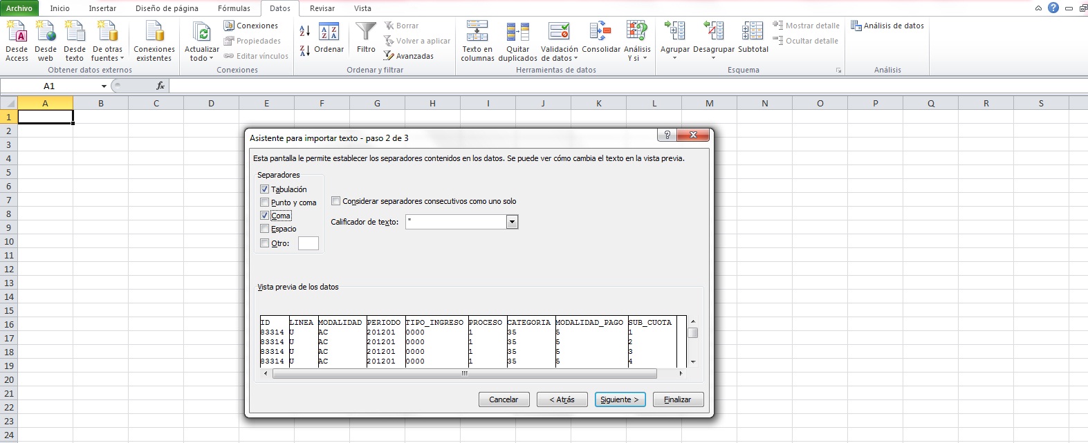 5. Paso 2 de 3: Te permite seleccionar los separadores de los caracteres, en nuestro caso marcamos (,) coma. En la vista previa se puede observar como excel separará nuestros datos.Hacer click en siguiente.