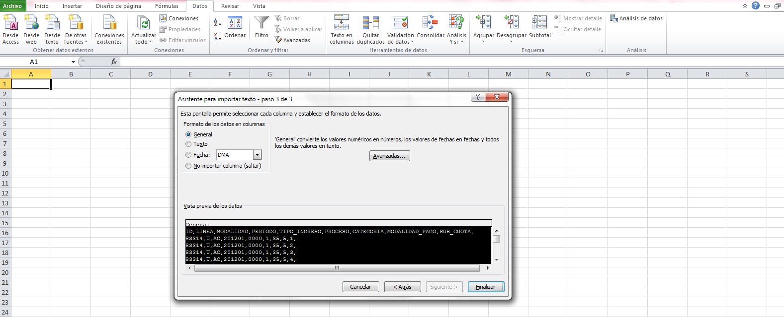6. Paso 3 de 3: Te permite seleccionar que formato deseas para tus datos por columnas. En nuestro caso pondremos General. Hacer click en finalizar.