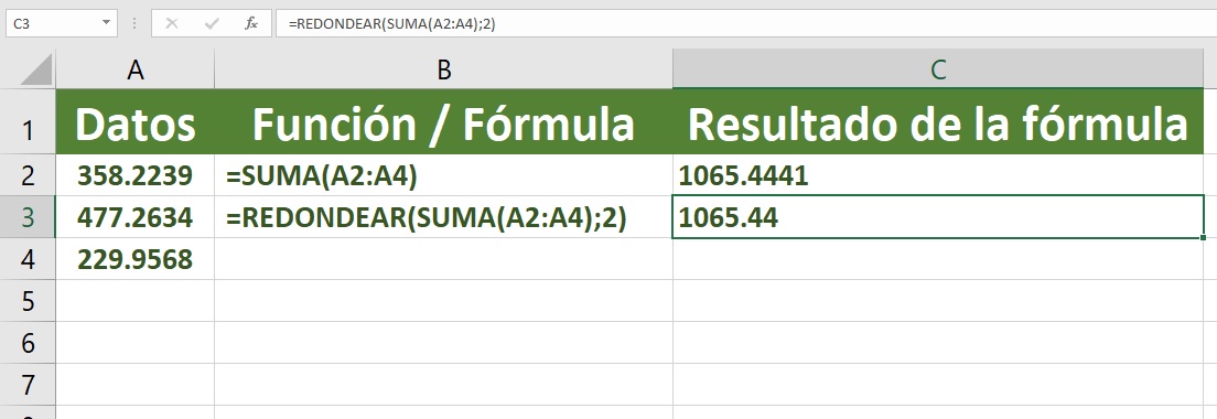 Esto se logra aplicando la función SUMA como el argumento Número de la función ROUND.
