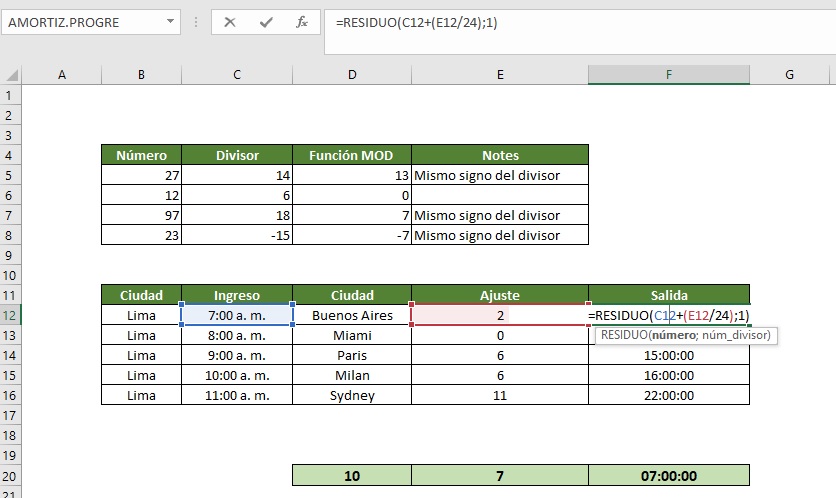 MOD(21,10)= 1. El MOD resultante lleva el mismo símbolo como el divisor.