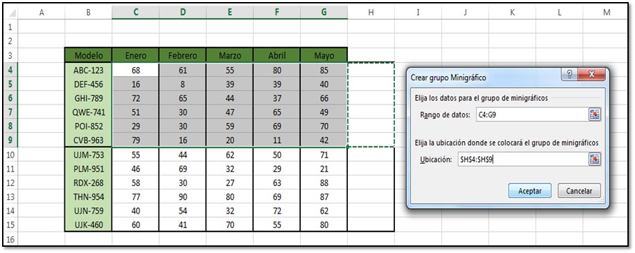 Procedemos a realizar una minigráfica para las ventas mensuales para los diferentes modelos de carros. Por ello debemos abrir el documento que presente el siguiente cuadro.