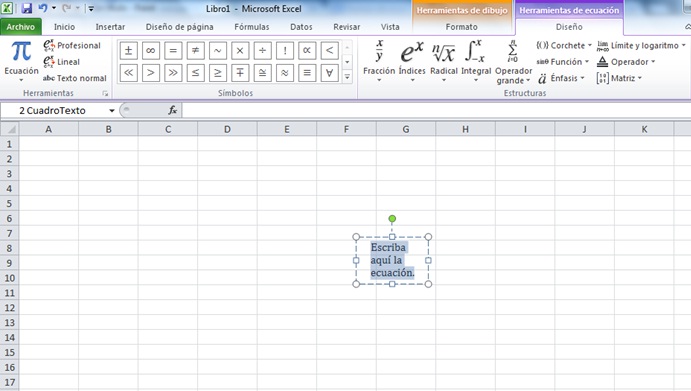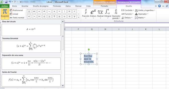 En Excel también se puede utilizar la herramienta de ecuaciones tanto para poder insertar una nueva ecuación o ecuaciones preestablecidas por el Excel.