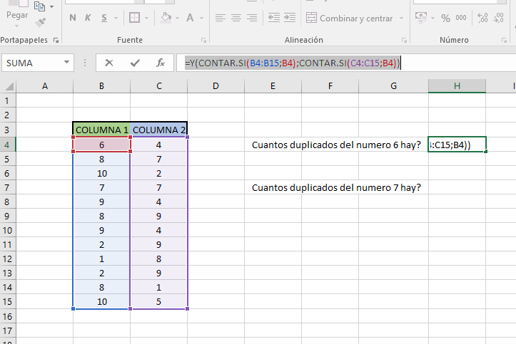 Buscaremos en ambas columnas si se repite el numero 6 en algun lado , para ello pondremos la sgte formula:
