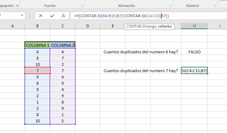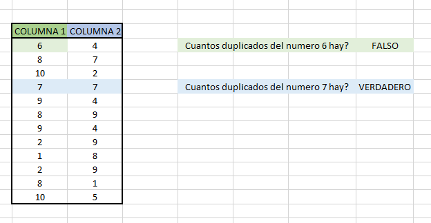Al aplicar la formula para buscar si hay un duplicado del numero 7 obtendremos para este caso VERDADERO ya que si hay otro 7 en las columnas