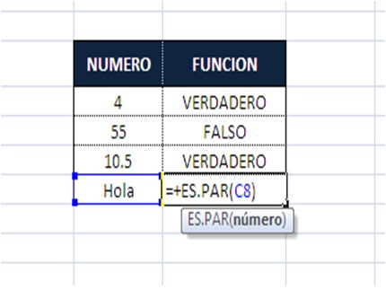 Esta función es contraria a la anterior, mientras que ES.PAR devuelve "Verdadero" si el número es par, ES.IMPAR devuelve "Verdadero" si el número es impar; en caso contrario, aparecerá la palabra "Falso". Así como la función anterior, sólo acepta valores numéricos.