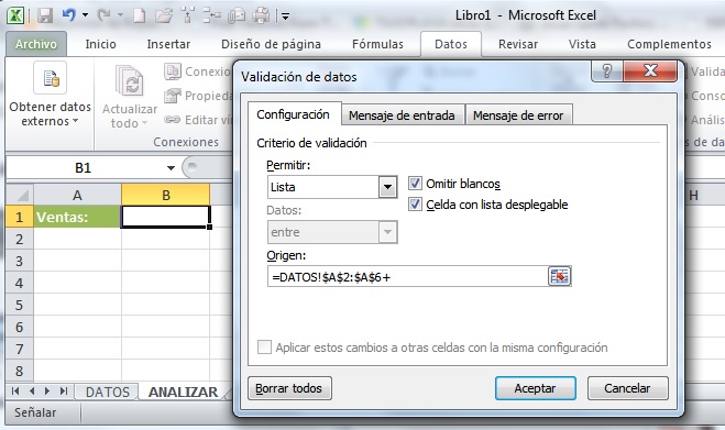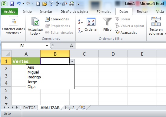 Utilizaremos una lista de validación de datos para hacer referencia a los datos de otra hoja. Esto es al momento de indicar el criterio de validación. Para fines prácticos, voy a crear una lista en la hoja titulada "ANALIZAR" que hace referencia a los datos de la hoja "DATOS":